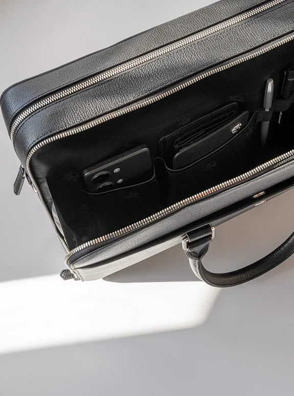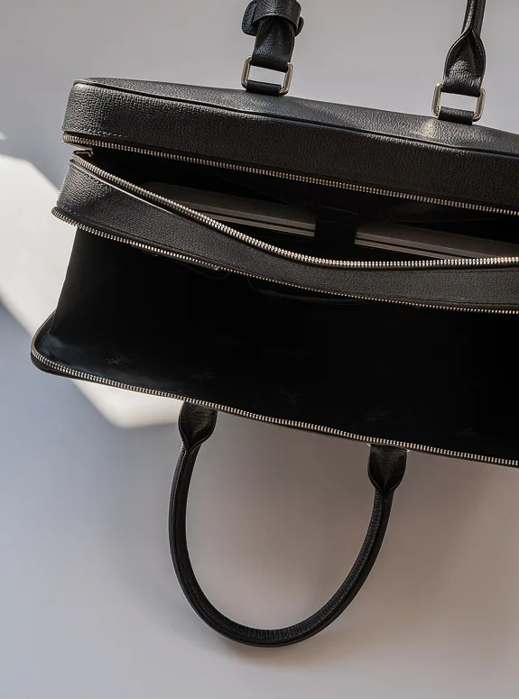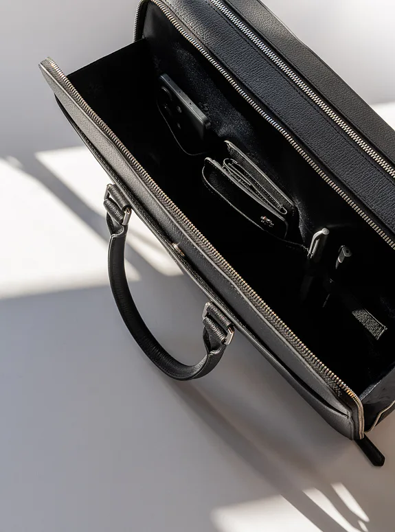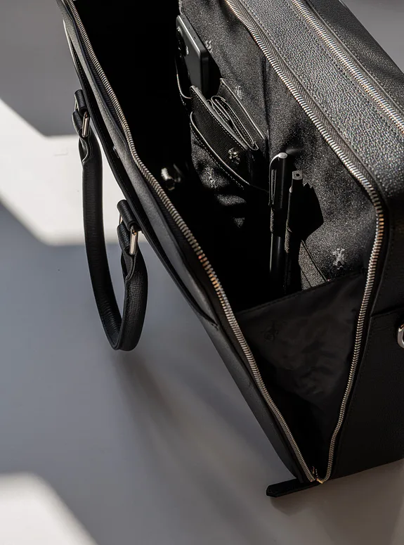 Podtrhněte svůj elegantní styl s touto černou taškou z přírodní kůže, která kombinuje praktičnost s luxusem, ať už jde o formální setkání nebo profesionální události.